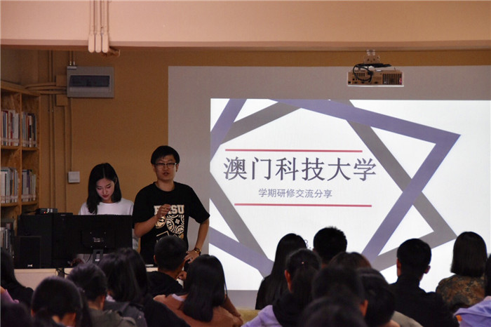 周三傍晚,国际交流办公室邀请到第一期参加澳门科技大学学期研修课程的李丛和刘豪两位同学们做分享,他们均来自国际商学院2016级财务管理专业。在艺术共建馆,这两位分享人首先介绍了澳门科技大学的校园、课程、考试情况及生活情况。两位同学分享到,澳门科技大学的课程都是全英文授课,考试试卷也是英文题目,所以需要大家努力应对。
